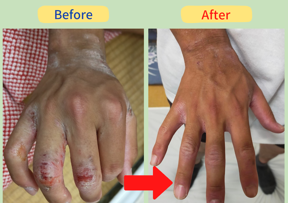 人前で手を出すのが辛かったり、炊事をする度に荒れる肌に本当に悩んでいました。3ヶ月施術を受けて今では水を使っても荒れなくなり、安心して家事ができています。/33歳 Uさん
