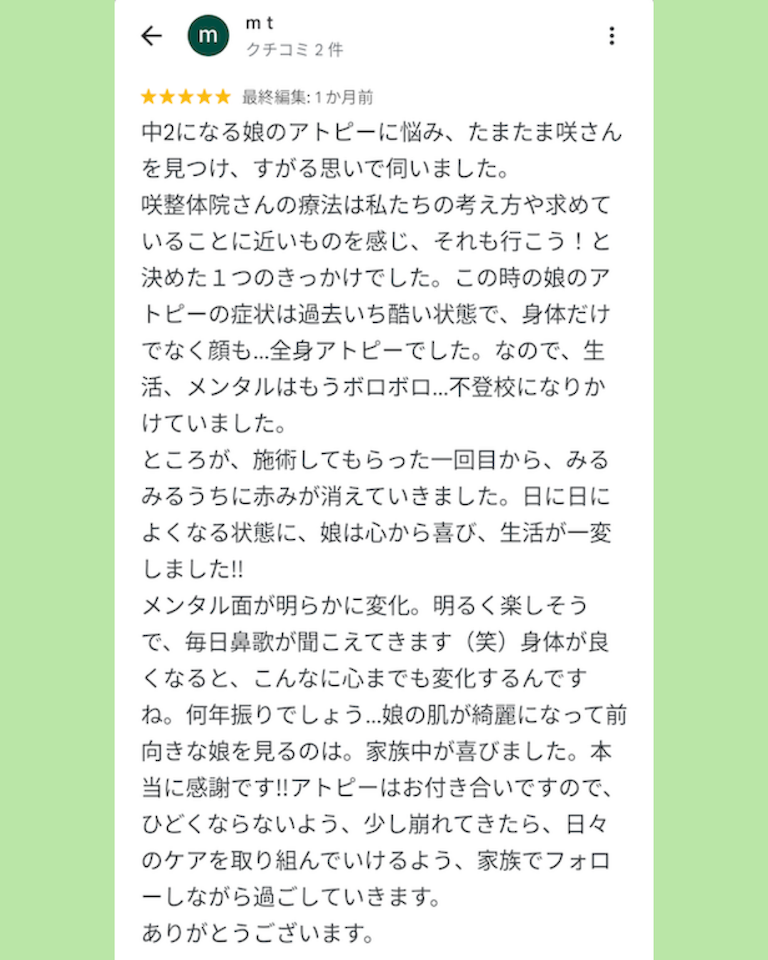 全身のアトピーで学校に行くのが辛かった毎日が、1回目の施術から赤みが引いていき、日に日に肌が良化していきました。身体が変わると気持ちも前向きになれ、今では学校に行くのが楽しみに変わりました。/14歳 Tさん