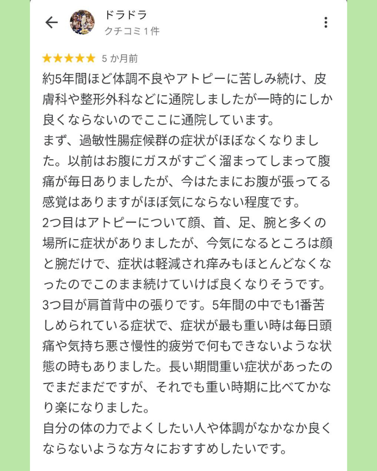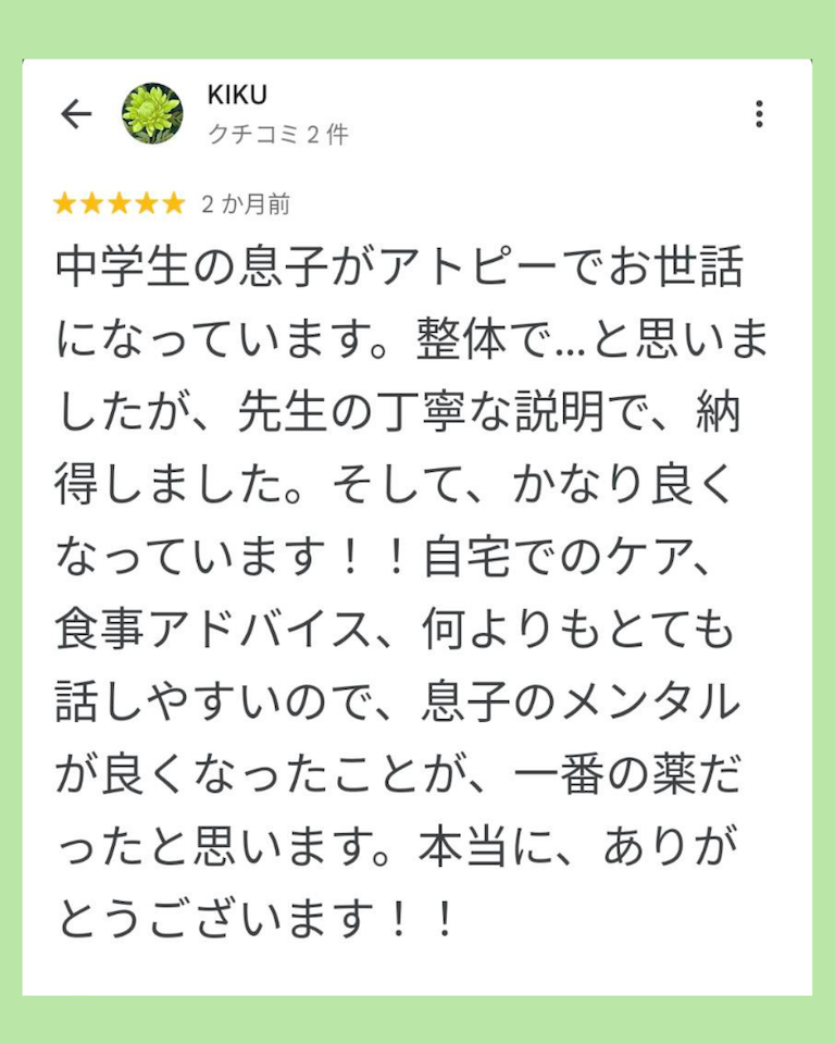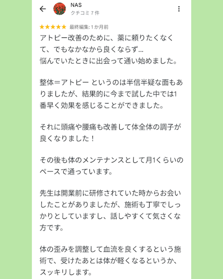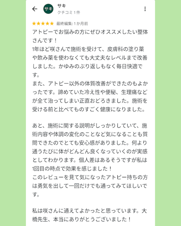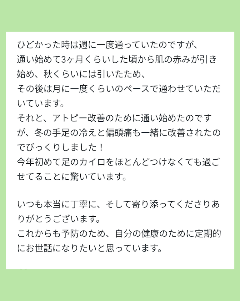 首全体にアトピー の症状が出ていて、人の目が気になって辛かったのですが、通いはじめて1ヶ月でとても良くなりました。施術以外にも、薬を使わずに早く治すために生活習慣などのアドバイスを教えて頂けるのでとても助かりました。/23歳 Iさん