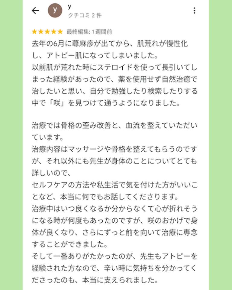 5年間ほどアトピーに苦しみ続け、皮膚科に通院していましたが、薬では一時的に良くなるだけで、すぐに再発を繰り返していました。顔や首、足、腕と広範囲に症状が出ていましたが、「咲」に通いはじめて少しずつ改善し、今ではほとんどの症状が軽減され、かゆみもほとんど無くなりました。1日中続いていた辛いかゆみが無くなったことで、快適に毎日を過ごせるようになり、本当にうれしく思っています。/24歳 Sさん