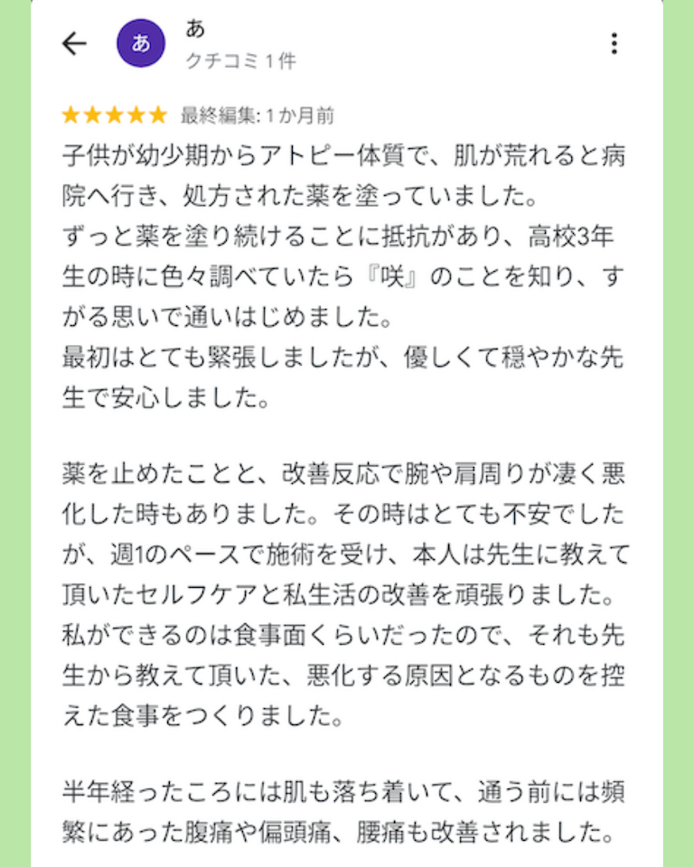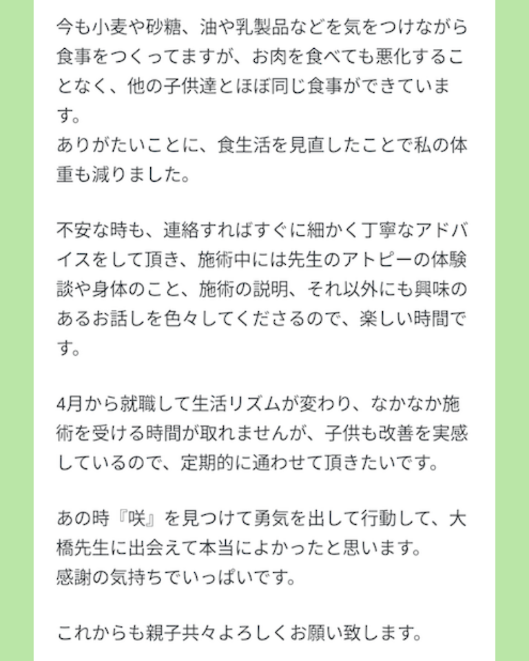 食事療法やサプリ、漢方、紫外線療法など、今まで本当に色々と試してきましたが、あまり効果を感じられませんでした。首や腕、足に出ていたアトピーもずっと改善せず悩んでいましたが「咲」に通い始めてから約1ヶ月半ほどで、症状がほとんど目立たなくなってきました。これまで何をやっても変わらなかったので驚いています。特に腕の症状が酷く、長年半袖を着られなかったのですが、この夏は半袖で過ごせるようになり、本当に嬉しい気持ちです。/35歳 Sさん