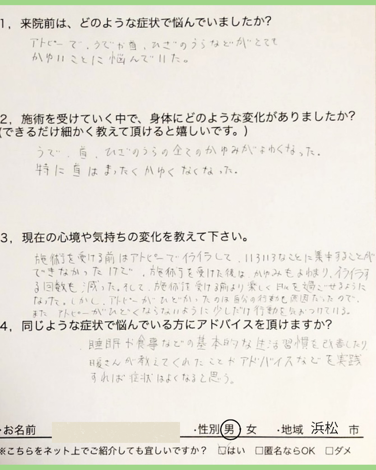痒みが強く、勉強や部活に集中できない日々が続いていました。「咲」に通い始めて約5ヶ月、少しずつ痒みが落ち着き、勉強や部活にもしっかり集中できるようになりました。/17歳 K君
