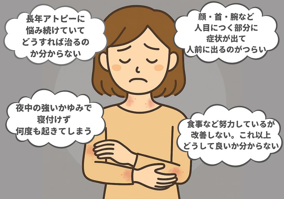 子供のころから重度のアトピーに悩まされてきました。皮膚科で処方された強い薬や注射もほとんど効かず、強いかゆみや、顔に出る症状によるコンプレックスでずっと苦しんでいました。