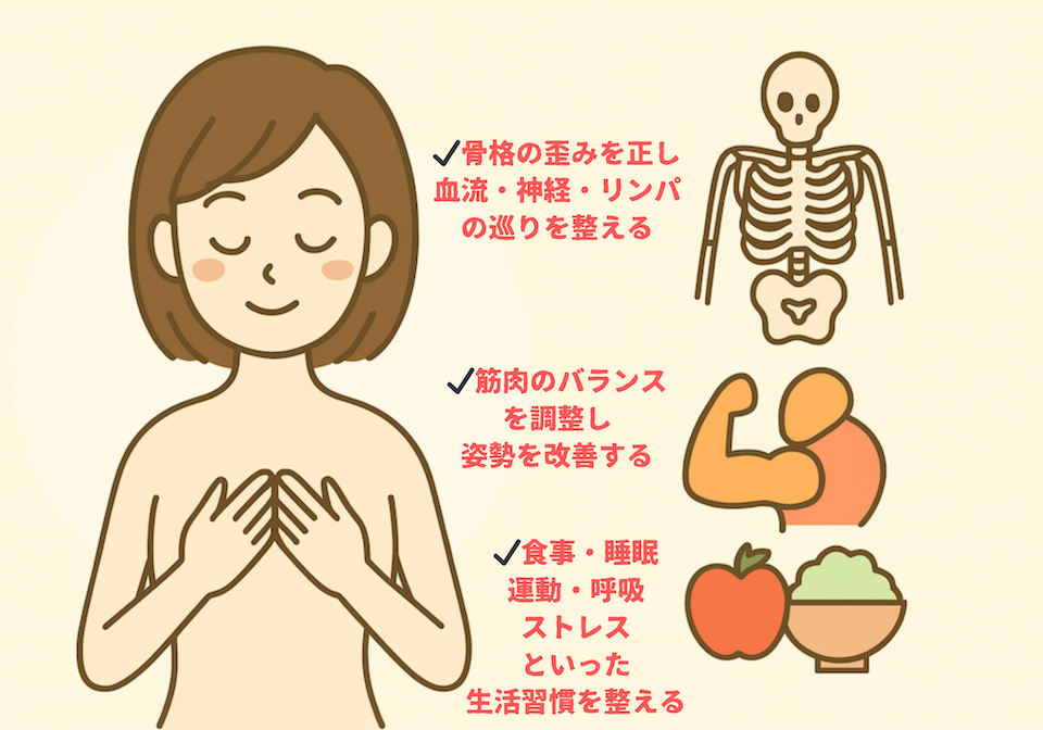 整体施術を中心に、骨格調整や筋肉バランスを整え、血流・神経・リンパの流れを促します。