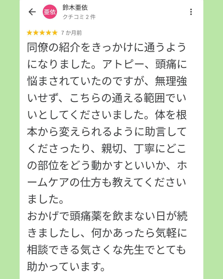 Googleマップ口コミ頭痛とアトピーの悩みが改善し、安心して相談できました 同僚の紹介をきっかけに通うようになりました。アトピー、頭痛に悩まされていたのですが、無理強いせず、こちらの通える範囲で通いとしてくださいました。体を根本から変えられるように助言してくださったり、親切、丁寧にどこの部位をどう動かすといいか、ホームケアの仕方も教えてくださいました。おかげで頭痛薬を飲まない日が続きましたし、何かあったら気軽に相談できる気さくな先生でとても助かっています。