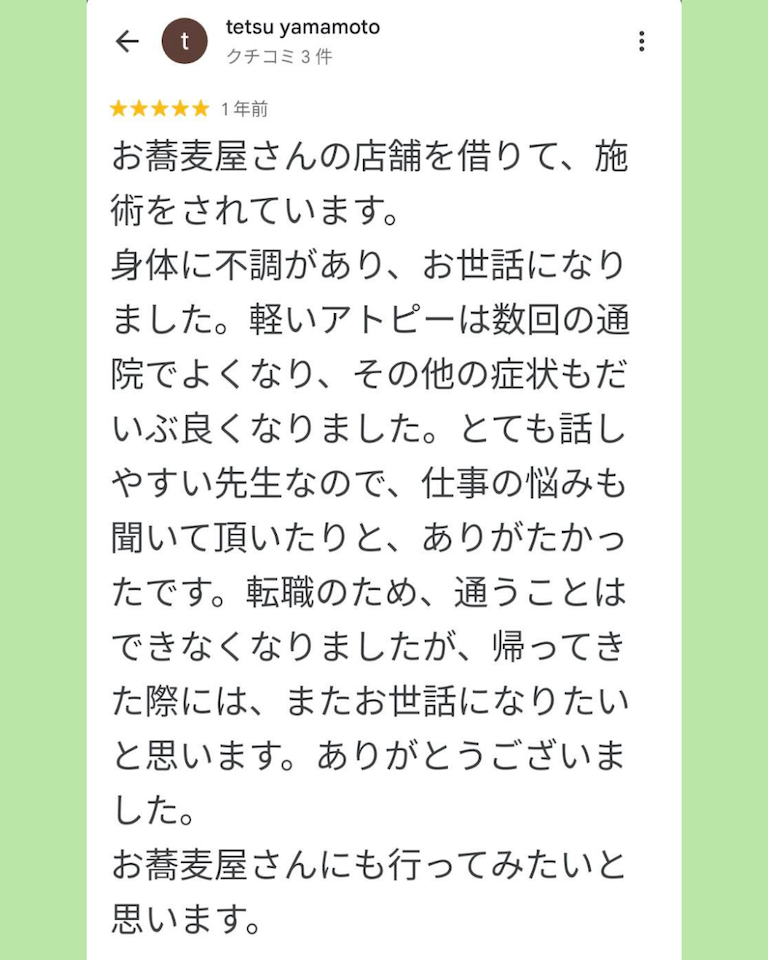 Googleマップ口コミ数回の通院でアトピーが改善しました。話しやすい先生です^_^ お蕎麦屋さんの店舗を借りて、施術をされています。身体に不調があり、お世話になりました。軽いアトピーは数回の通院でよくなり、その他の症状もだいぶ良くなりました。とても話しやすい先生なので、仕事の悩みも聞いて頂いたりと、ありがたかったです。転職のため、通うことはできなくなりましたが、帰ってきた際には、またお世話になりたいと思います。ありがとうございました。 お蕎麦屋さんにも行ってみたいと思います。