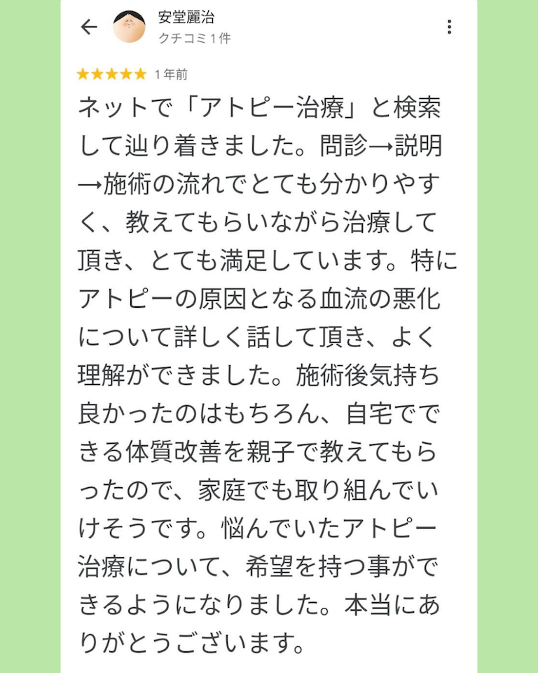Googleマップ口コミアトピーの原因が理解できて治療に希望が持てました ネットで「アトピー治療」と検索して辿り着きました。問診→説明→施術の流れでとても分かりやすく、教えてもらいながら治療して頂き、とても満足しています。特にアトピーの原因となる血流の悪化について詳しく話して頂き、よく理解ができました。施術後気持ち良かったのはもちろん、自宅でできる体質改善を親子で教えてもらったので、家庭でも取り組んでいけそうです。悩んでいたアトピー治療について、希望を持つ事ができるようになりました。本当にありがとうございます。