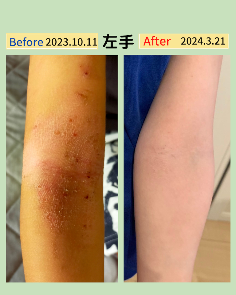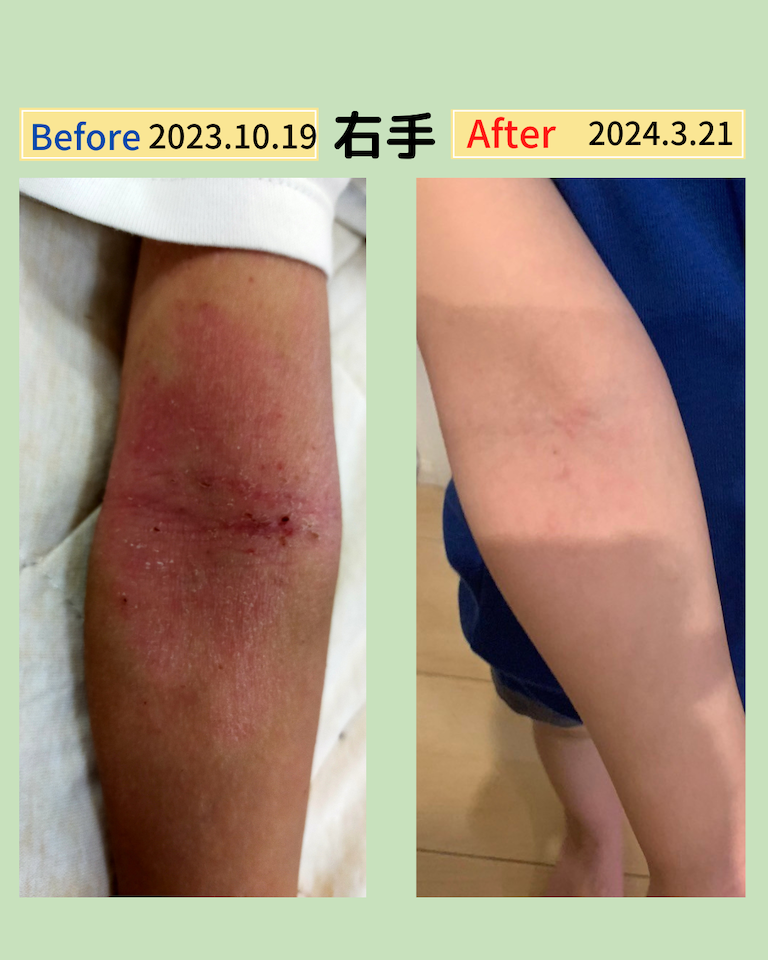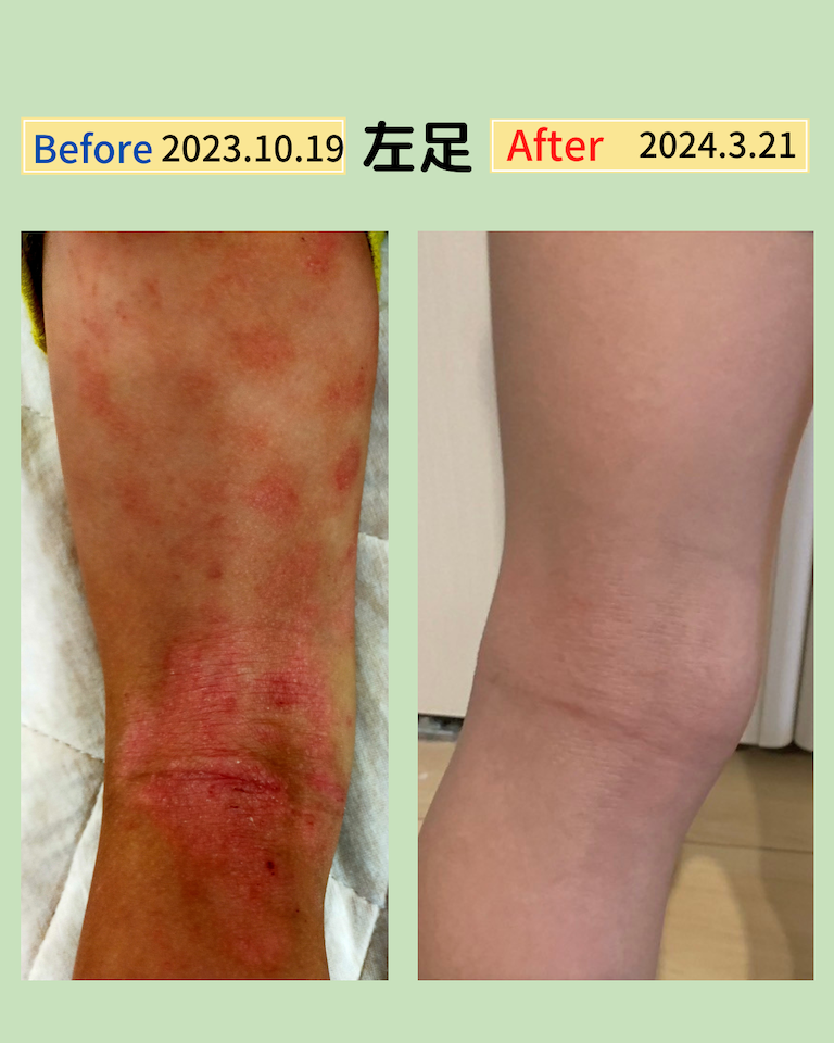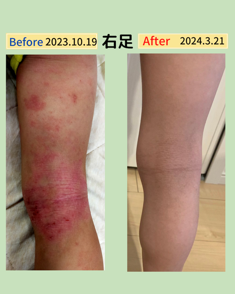 首・腕・太もも・膝裏など、広い範囲に症状が出ていましたが、お母さんは「なるべくステロイドは使いたくない」との思いから、食事や睡眠など生活習慣の見直しをしながら根気よく対応されていました。
