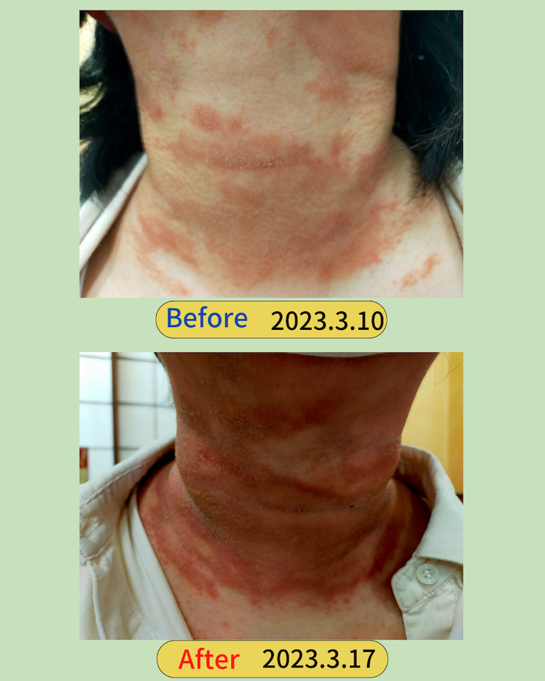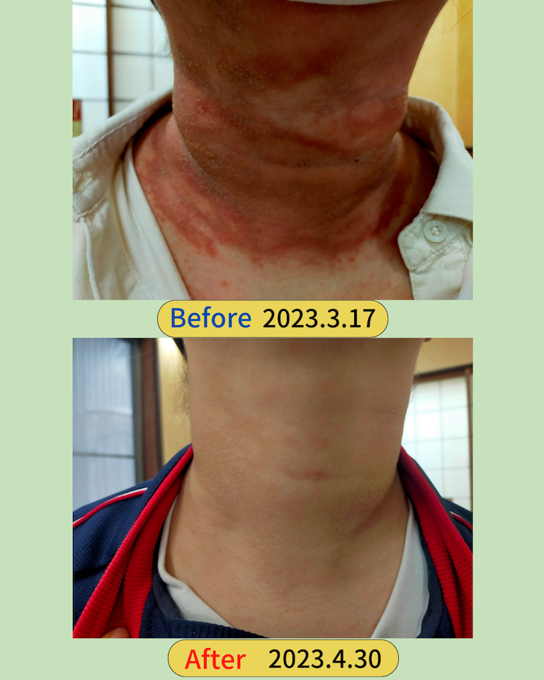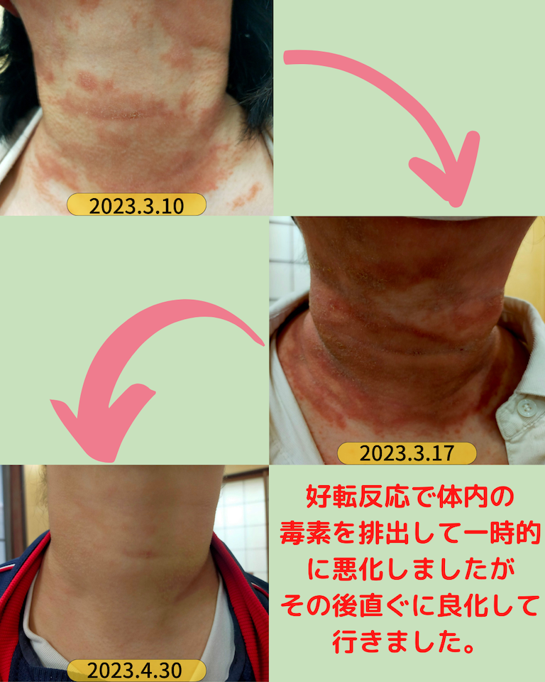 その結果、顔や首の強い炎症はみるみるうちに改善し、現在では腕にわずかな症状が残る程度。