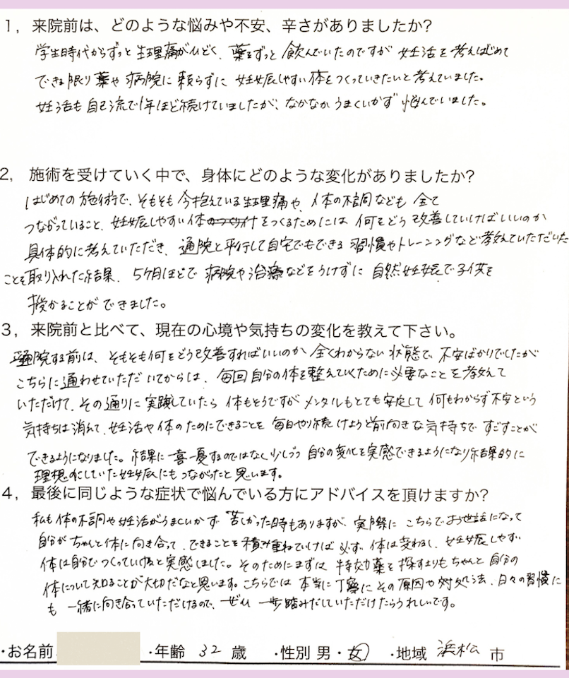 施術回数:7回 約3ヶ月通院 / 施術ペース : 週1回〜2週に1回 (妊娠までの期間) 年齢:32歳